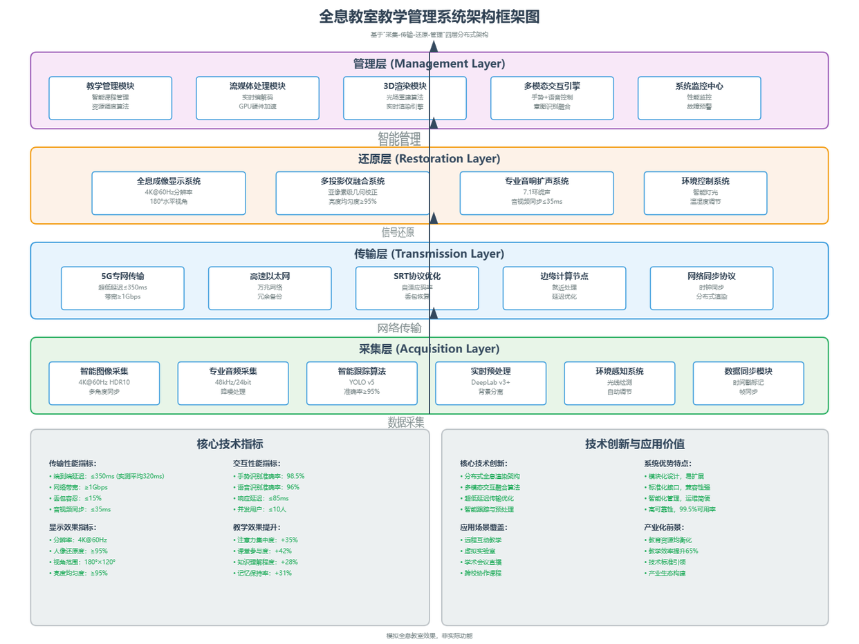 全息教室教学管理系统采用分层分布式架构设计,遵循"高内聚、低耦合"的软件工程原则。系统整体架构可概括为"采集-传输-还原-管理"四位一体的技术框架,形成从教学内容获取到沉浸式呈现的完整闭环。