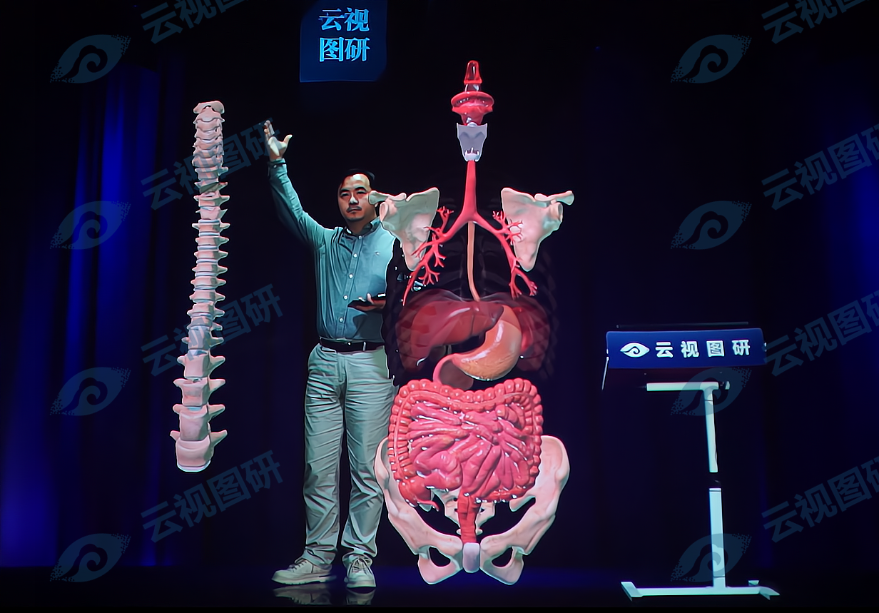 在课堂现场,教师的人像经采集与渲染后,以1∶1比例立体还原于学生视域内,表情与肢体动作清晰可辨;课程中的三维模型、板书与PPT内容可作为全息元素与教师影像共同呈现,形成多层次的虚实融合教学空间。学生可围绕模型进行旋转、分解、缩放等交互式观察,在理论阐释、案例讲解与价值引导之间建立更直接的感知通道,降低抽象概念的理解门槛,增强思政课堂的现场感与吸引力。